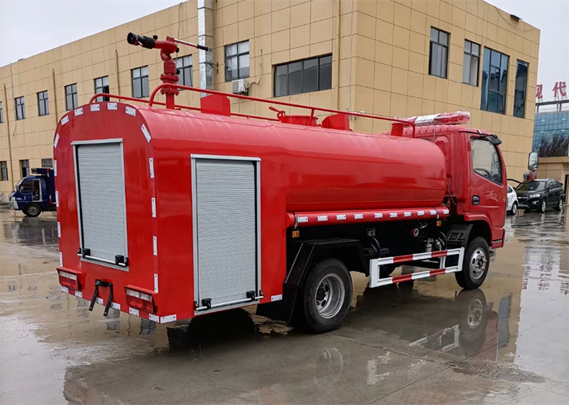 東風多利卡消防灑水車:罐體容積 6.8 立方,達到國五排放標準,配備消防泵和消防炮,射程可達 50 米以上