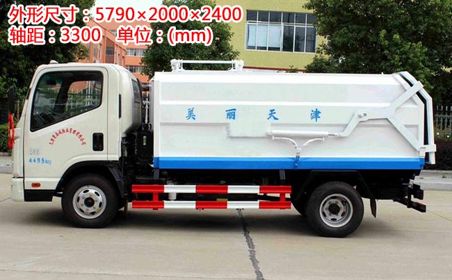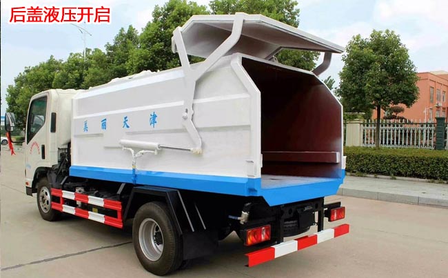 箱體容積5~6立方米,外形與掛桶垃圾車相似,箱體材料邊三底四碳鋼,內(nèi)部做防銹處理,側(cè)方帶掛桶提升機構(gòu),車尾部橡膠密封條,內(nèi)置推板,后蓋液壓開啟。