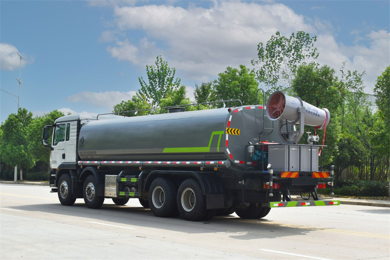 該車主要用于城鄉園林綠化噴灑作業.主要裝置為罐體及噴灑裝置;罐體總容量:19.67立方米;罐體有效容積:18.74立方米;罐體外形尺寸(長×長軸×短軸)(mm):7300×2450×1650.僅采用軸距(mm):1800+3800+1350改裝.側、后防護材料均為:Q235碳鋼,連接方式均為:螺栓連接,后部防護截面尺寸(mm):120×50,后部防護離地高度(mm):490.ABS系統控制器生產企業/型號為采埃孚商用車系統(青島)有限公司/4460046300;隨底盤選裝駕駛室,選裝噴霧裝置樣式,選裝自動球閥安裝位置,選裝弧形噴灑裝置,選裝箭頭燈裝置,選裝大工作平臺,選裝前部不帶電子霧炮.選裝電子炮裝置樣式.當前部選裝電子炮裝置時,前伸為500mm,整車長度為11560mm,11750mm.隨底盤選裝限速裝置,限速89km/h.