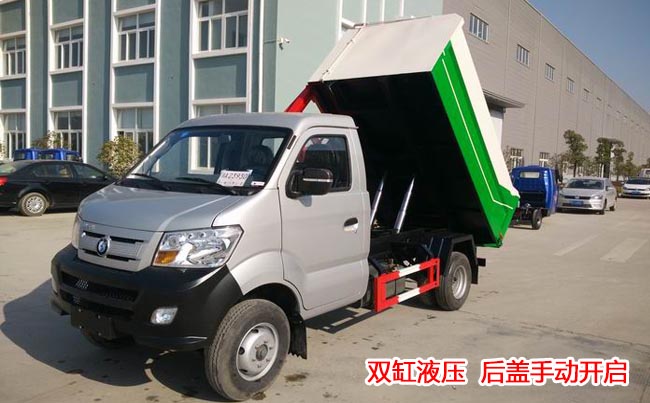 箱體容積3~4立方米,板材厚度邊3底4,箱體結(jié)構(gòu)為墻板形式,國產(chǎn)多路閥,油泵、取力器、油缸,駕駛室外部操作、箱體底部雙缸液壓舉升卸料,后門機械鎖緊、手動開啟。