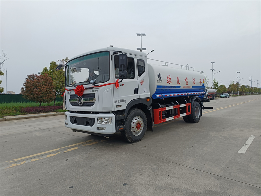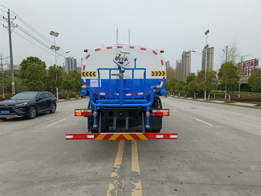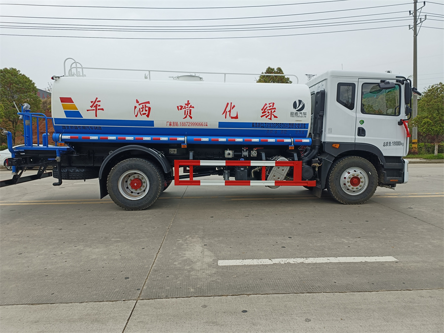 灑水車產品標配前噴(鴨嘴)、后沖、后灑、側噴、后置式工作 平臺,平臺上配置綠化水炮(可 360°旋轉,既可以調成柱狀,也可 以調成霧狀,更可以調成直沖狀、大雨、中雨、小雨、毛毛雨),配 備優質大功率專用灑水泵(可自吸自排,可從河里或池塘抽水到罐體), 取力器,雜物過濾網,消防接口,自流球閥系統、取力器、球閥、濾網 均為國家標準產品,主管道加粗,法蘭墊、法蘭盤加厚,大通徑球閥。 整體具備性能優良安全可靠、效率高、流量大、維修方便等特點。