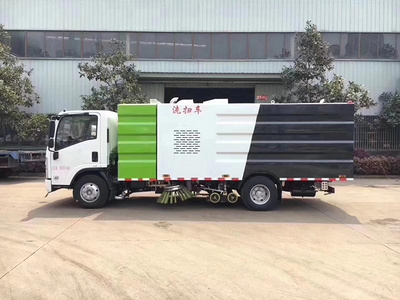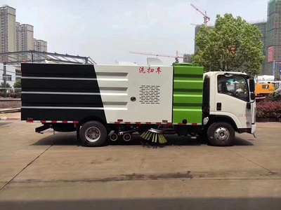 本洗掃車采用重慶五十鈴(700P)型國(guó)5二類底盤改裝,加裝副發(fā)動(dòng)機(jī)、風(fēng)機(jī)、高壓水泵、清水箱、垃圾箱、左右立掃、帶噴水桿的寬吸嘴、低壓沖洗系統(tǒng)、垃圾箱自潔,掃盤降塵系統(tǒng),液壓系統(tǒng)、專用裝置電控系統(tǒng)和副車架等改裝而成: