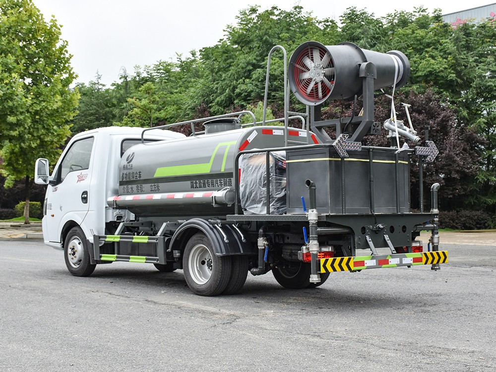 東風(fēng)途逸 2.5 方抑塵車主要技術(shù)參數(shù) 序號 名稱 型號、規(guī)格 1 整車型號 CLT5040TDYEQ6 型多功能抑塵車 2 發(fā)動機(jī)型號 Q23-95E60 3 發(fā)動機(jī)馬力/功率 全柴 95 馬力/70KW 4 發(fā)動機(jī)排量 2300ML 5 變速箱 萬里揚(yáng) 5 檔 6 輪胎規(guī)格 185 真空胎 7 軸距 2800 8 總質(zhì)量 4495KG 9 整備質(zhì)量 2880KG 10 額定載質(zhì)量 1485KG 11 整車尺寸(長×寬×高) 5.8*1.85*2.6 12 罐體容積 2.5 方 13 燃料種類 柴油 14 排放標(biāo)準(zhǔn) 國六 15 水泵型號 40/50 16 罐體材質(zhì) Q235 碳鋼四. 產(chǎn)品功能展示 霧炮 后灑 后對沖 高炮 側(cè)噴